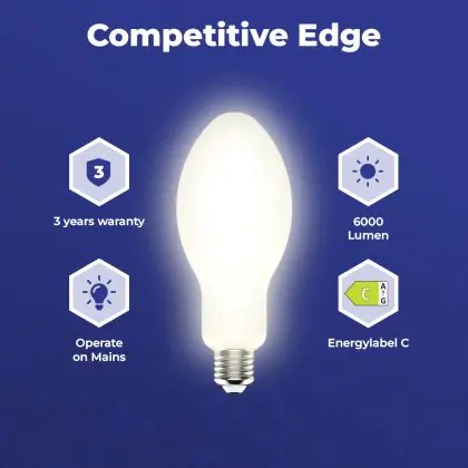 Cette ampoule LED HID Elliptique E40 36W 6000lm - 840 Blanc Froid | Remplacement 125W est le remplacement idéal des lampes à décharges classiques. Grâce à sa faible consommation d'énergie, vous pourrez économiser beaucoup d'énergie. Cette lampe Budgetlight ne consomme en effet que 36W en remplaçant les anciennes lampes de 125 W. Cette lampe a une classe énergétique élevée C ce qui signifie que vous pourrez faire des économies d'énergie susbtantielles. Avec sa durée de vie moyenne étendue, environ 25000 heures, vous n'aurez pas à la changer avant plusieurs années.