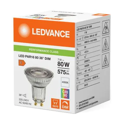 Cette ampoule Ledvance LED PAR16 GU10 Réflecteur 7W 575lm 36D - 940 | Meilleur Rendu De Couleur - Dimmable - Remplacement 80W est le produit de remplacement idéal pour votre ancienne ampoule avec un culot GU10. Grâce à la technologie LED intégrée, vous pourrez faire des économies d’énergie substantielles. Ce spot Ledvance LED PAR16 GU10 Réflecteur 7W 575lm 36D - 940 | Meilleur Rendu De Couleur - Dimmable - Remplacement 80W avec son efficacité lumineuse de lumen par watt, vous permettra de profiter d’un éclairage de qualité en toute circonstance.